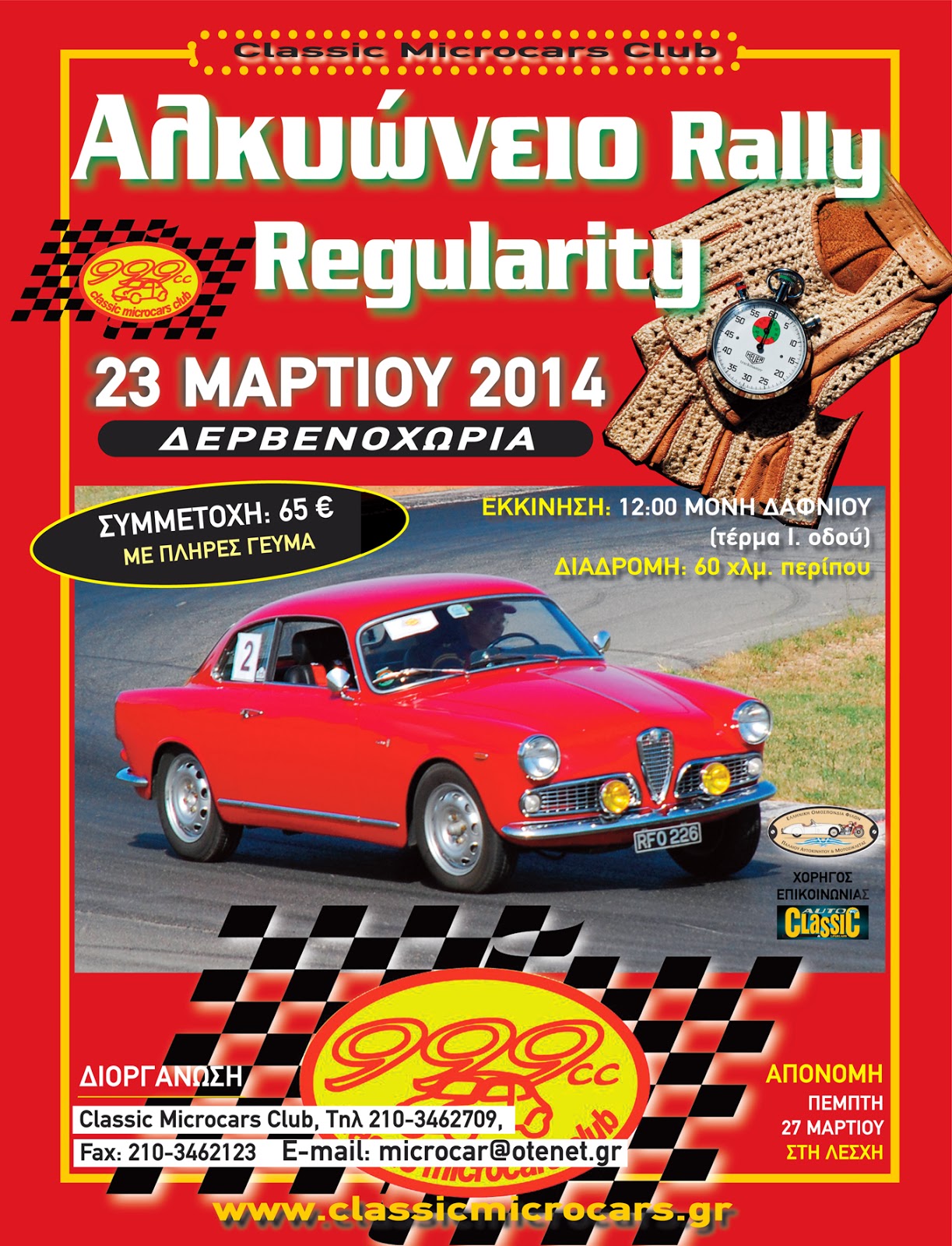 Η λέσχη Classicmicrocars ανακοινώνει την τέλεση regularity rally που θα διεξαχθεί στις 23 Μαρτίου 2014 στην περιοχή των Δερβενοχωρίων στη θέση του αναβληθέντος στις 20/1/2014 Αλκυωνείου. Η εκκίνηση θα δοθεί στις 12:00 από το τέρμα της Ιεράς Οδού, στην Μονή Δαφνίου για μία διαδρομή περίπου 60 χιλιομέτρων . Αποτελέσματα και απονομή θα γίνουν την Πέμπτη 27 Μαρτίου στην Λέσχη.