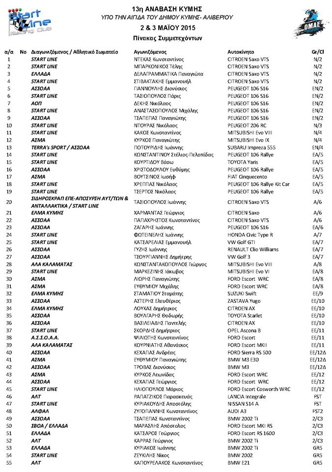 Προσωρινές συμμετοχές: 13η ΑΝΑΒΑΣΗ ΚΥΜΗΣ – 2 & 3 ΜΑΪΟΥ 2015