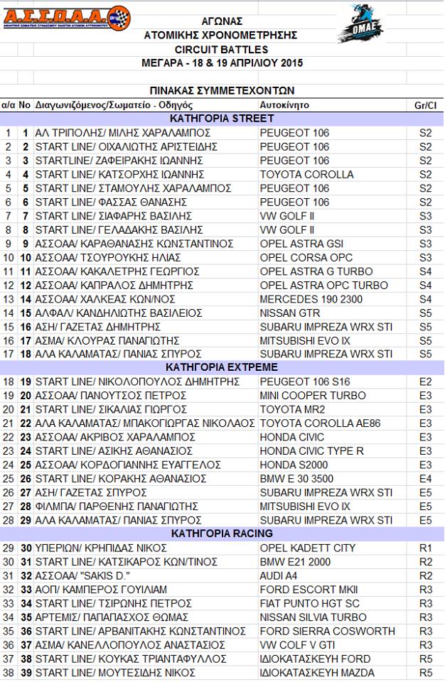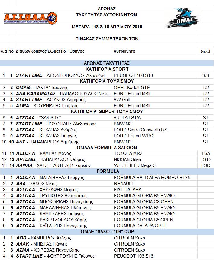 Tο Πανελλήνιο Πρωτάθλημα Ταχύτητας του 2015 ξεκινάει μία βδομάδα μετά το Πάσχα. Στις 18 & 19 Απριλίου η πίστα των Μεγάρων θα φιλοξενήσει αγώνες Touring & Super Turing αυτοκινήτων, την κατηγορία Formula Saloon, τον θεσμό saxo – 106 CUP, τους αγώνες Επάθλου Ατομικής Χρονομέτρησης – Circuit Battles και το Single Seater Trophy.