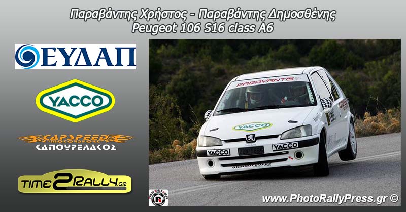 Στην κόντρα των Ράλλυ για το φετινό Κύπελλο Ασφάλτου του 2015, δηλώνουν παρόντες και έτοιμοι οι Παραβάντης Χρήστος και Παραβάντης Δημοσθένης με το Peugeot 106 S16 της κλάσης Α6. Οι αθλητές της Αγωνιστικής Λέσχης Τριπόλεως θα αγωνιστούν για την κατάκτηση του τίτλου τόσο στην κλάση τους (Α6) αλλά και στην F2.