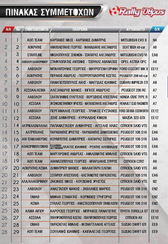Ανάμεσά τους οι πρωτοπόροι της βαθμολογίας του Κυπέλλου Καρπάνος Νίκος, Αναπολιωτάκης Γεώργιος και ο τοπικός Σταφυλοπάτης Αντώνιος. Επίσης παρόντες για την F2 θα είναι οι Κουμποτής Δημήτριος, Ζακχαίος Νίκος, Μαργαρώνης Ανδρέας από την Πάτρα, Σύλλας Γιώργος και ο Παραβάντης Χρήστος από την Τρίπολη. Αναμένεται να δούμε πολύ ωραίες μάχες στην Α6 και στην Α7, αφού τα πληρώματα είναι δυνατά. Στην Ε συμμετέχουν οι Νικολόπουλος Ξενοφών με το πολύ δυνατό EVO της ΕΑ8 και ο Μπαλτούνης Γεώργιοςμε το θεαματικό Ford Escort ΜΚ2.