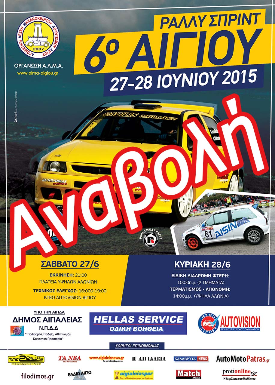 Η Αγωνιστική Λέσχη Μηχανοκίνητου Αθλητισμού Αιγίου (Α.Λ.Μ.Α.), μετά από απόφαση του ΔΣ ανακοινώνει την αναβολή του αγώνα «6ο Ράλλυ Σπριντ Αιγίου 2015» που είχε προγραμματιστεί για τις 27 -28 Ιουνίου 2015, λόγω λιγοστών δηλώσεων συμμετοχών. Η νέα ημερομηνία του αγώνα θα οριστεί από την Ομοσπονδία Μηχανοκίνητου Αθλητισμού Ελλάδος (ΟΜΑΕ) τις επόμενες μέρες.