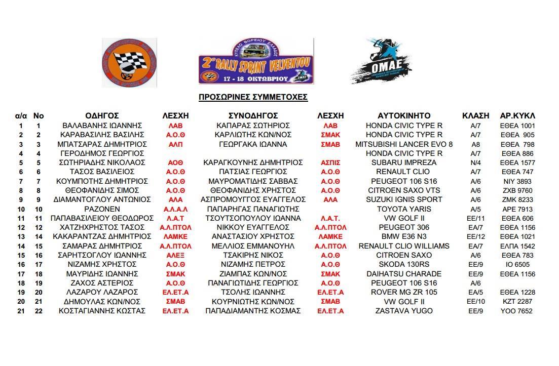 Οι προσωρινές συμμετοχές του 2ου Rally Sprint Βελβεντού…