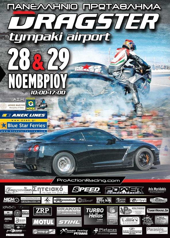 Ο τελευταίος αγώνας του πανελληνίου πρωταθλήματος dragster αυτοκινήτων αλλά και μοτοσυκλετών υπό την αιγίδα της ΟΜΑΕ και ΑΜΟΤΟΕ , θα γίνει για άλλη μια φορά στην θερμότερη και νοτιότερη πίστα της Ελλάδας (αεροδρόμιο Τυμπακιου 28-29/11). Η κορυφαία πρόσφυση είναι η αιτία που όλοι θέλουν να κατέβουν για να ρίξουν κι άλλο τους ήδη φοβερούς χρόνους που έχουν πετύχει πολλοί οδηγοί σε διάφορες κατηγορίες αυτοκινήτων αλλά και μοτοσυκλετών. Πολλοί είναι αυτοί που ετοιμάζονται πυρετωδώς για να κατέβουν στην μεγαλόνησο , και μάλλον μιλάμε για έναν αγώνα που θα μείνει στην ιστορία για τους χρόνους που θα γίνουν.. Oι συμμετοχές θα σταματήσουν στις 130.