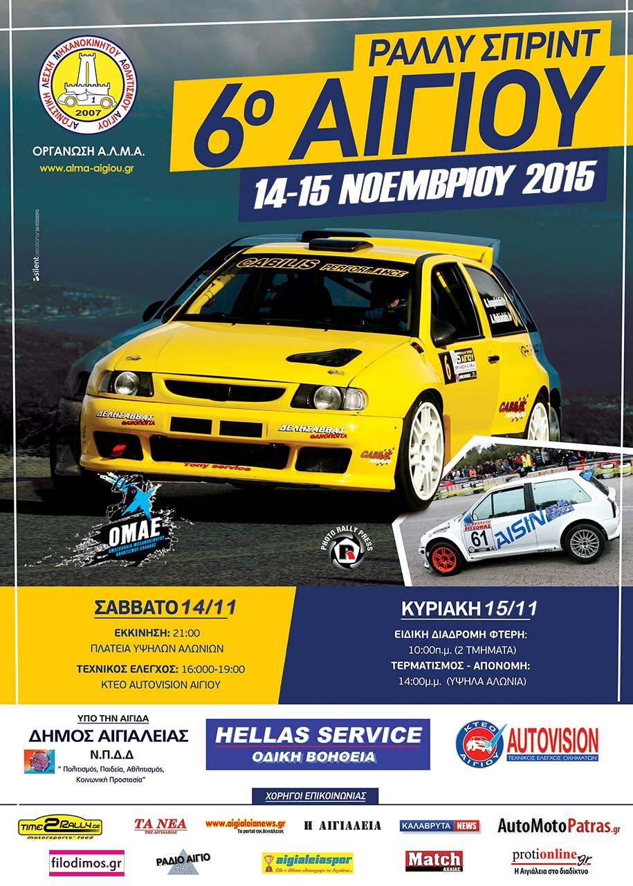 Το σωματείο ΑΛΜΑ Αιγίου θα υποδεχτεί τους αγωνιζόμενους, μηχανικούς και τους φίλους των Ράλλυ το Σάββατο 14 Νοεμβρίου στις φιλόξενες εγκαταστάσεις του ΙΚΤΕΟ Αιγίου Αutovision, για την διεξαγωγή του τεχνικού ελέγχου από τις 16:00 έως τις 19:00 ώρα. Μετά στις 21:00 ώρα θα ακολουθήσει Πανηγυρική Εκκίνηση στα Υψηλά Αλώνια Αιγίου, όπου εκεί θα μπορέσουν οι θεατές να παρατηρήσουν από κοντά τα αυτοκίνητα και τους αθλητές – αγωνιζόμενους. Την Κυριακή η δράση θα μεταφερθεί στο βουνό ξεκινώντας 10:00 ώρα το πρωί από το χωριό Φτέρη.