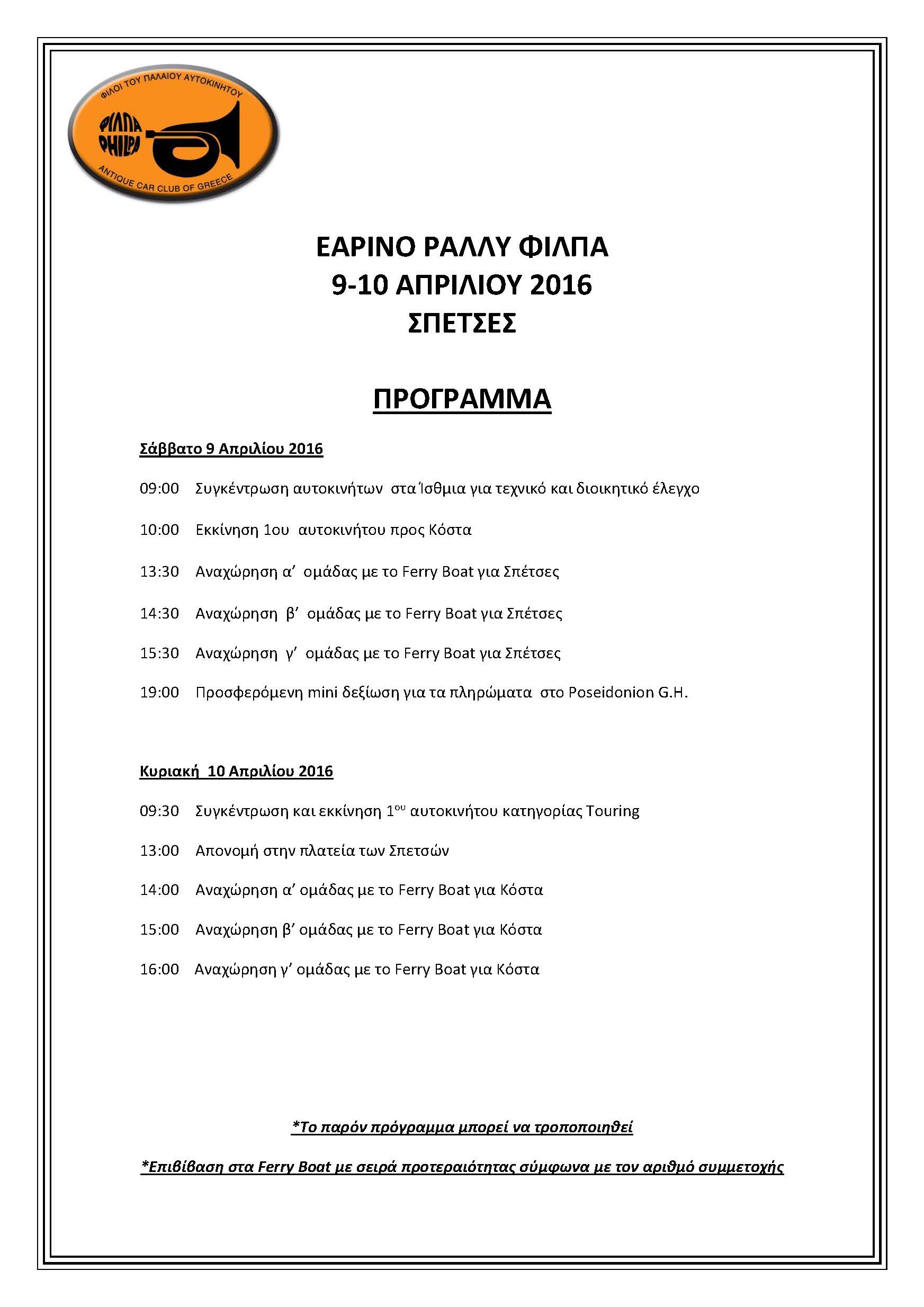 Το αρχοντικό νησί των Σπετσών θα φιλοξενήσει και φέτος την Εκδήλωσή “ΕΑΡΙΝΟ ΡΑΛΛΥ ΦΙΛΠΑ”, η οποία εντάσσεται στο Πρόγραμμα Διεθνών Εκδηλώσεων της FIVA (Κατηγορία Α΄ – Αριθμός ΙΡ 09/2016), και προσμετρά στο “Κύπελλο Regularity ΦΙΛΠΑ 2016”.
