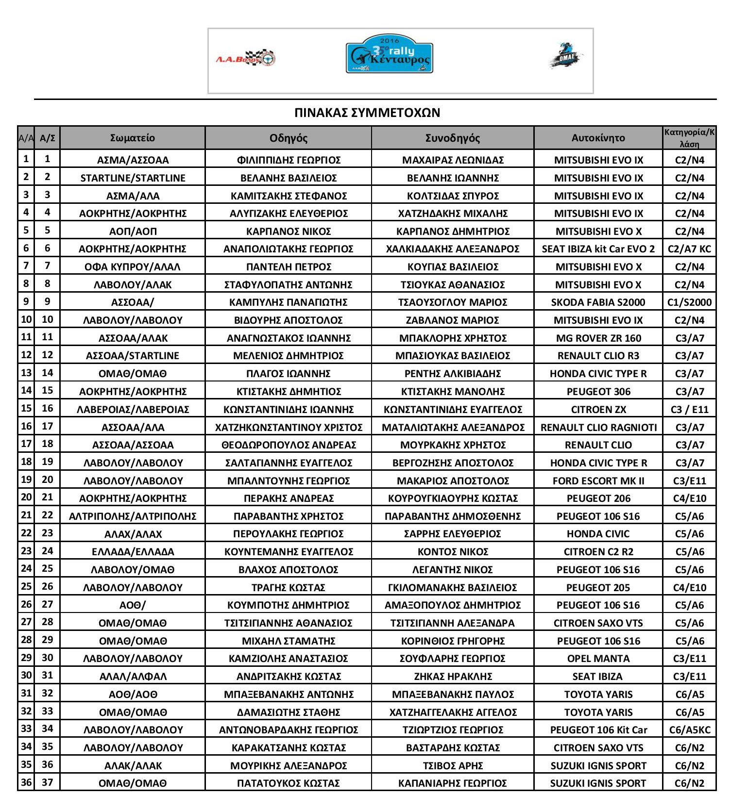 Με πάνω από 35 πληρώματα να παίρνουν εκκίνηση από το Πανεπιστήμιο Θεσσαλίας στην παραλία του Βόλου, θα ξεκινήσει το ερχόμενο Σαββατοκύριακο το 35ο Ράλλυ Κένταυρος 2016. Οι συμμετοχές παρά το δύσκολο της οικονομικής κρίσης έχουν όλους τους πρωταγωνιστές και διεκδικητές του θεσμού. Ανάμεσά τους συγκαταλέγονται οι Φιλιππίδης Γιώργος, Βελάνης Βασίλης, Καμιτσάκης Στέφανος, Αλυγιζάκης Λευτέρης, Καμπύλης Παναγιώτης, Αναπολιωτάκης Γιώργος, αλλά και όλοι όσοι ακολουθούν το Πρωτάθλημα ή όχι. Μάλιστα, αξίζει να σημειώσουμε ότι όσοι βρεθούν στο βουνό του Πηλίου την ημέρα του αγώνα θα έχουν τη δυνατότητα να παρακολουθήσουν από κοντά τουλάχιστον 10 αυτοκίνητα Mitsubishi Evo, αλλά και Skoda Fabia S 2000!!