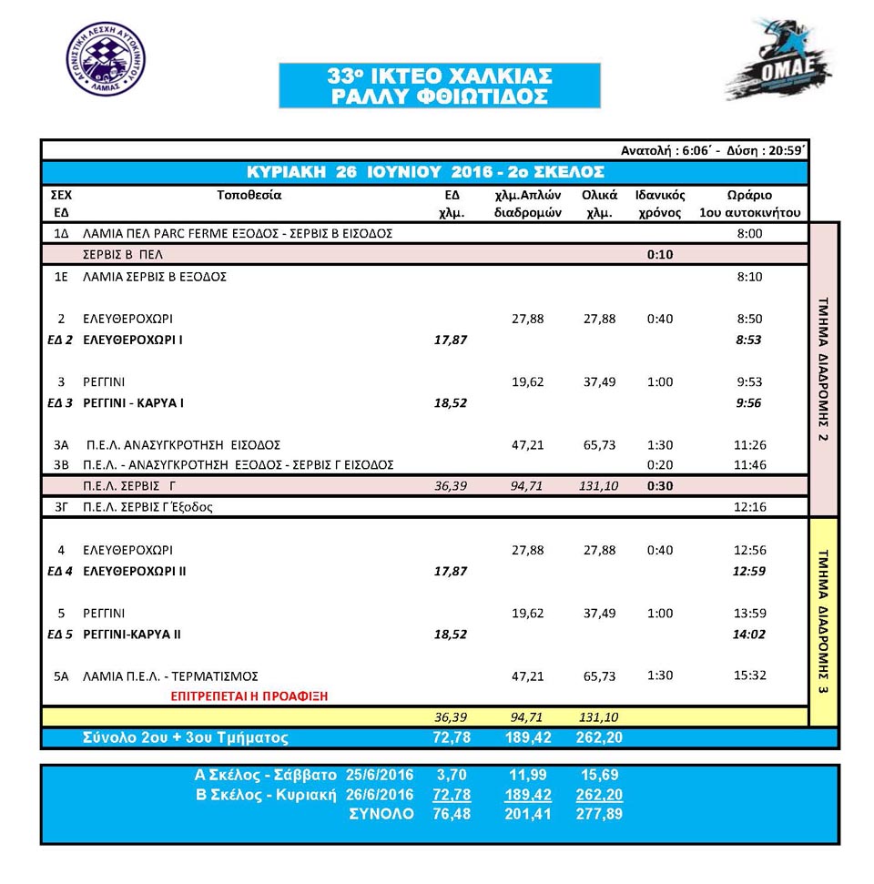 Το αγωνιστικό μέρος του αγώνα, θα ξεκινήσει το απόγευμα του Σαββάτου 25 Ιουνίου, με τη διεξαγωγή της Υπερειδικής Διαδρομής “Λαμία” που έχει μήκος 3,7 χιλιομέτρων και χρησιμοποιήθηκε ως Κατατακτήρια Ειδική Διαδρομή στο Seajets Ράλλυ Ακρόπολις. Πρόκειται για γρήγορη, θεαματική και με μεγάλη ορατότητα διαδρομή, που αναμένεται να προσελκύσει μεγάλο αριθμό θεατών. Μετά την διεξαγωγή της Υπερειδικής τα αυτοκίνητα θα επιστρέψουν στην Πανελλήνια Έκθεση Λαμίας για το βραδινό σέρβις και την προετοιμασία για το κυρίως μενού του ράλλυ, που θα… σερβιριστεί την Κυριακή 26 Ιουνίου και περιλαμβάνει δύο αγαπημένες, επαναλαμβανόμενες Ειδικές Διαδρομές. Ο λόγος για την Ειδική Διαδρομή “Ελευθεροχώρι”, που θα χρησιμοποιηθεί ακριβώς με την ίδια φορά που είχε στο Seajets Ράλλυ Ακρόπολις 2016, έχει μήκος 17,87 χιλιομέτρων, κατεύθυνση από Ελευθεροχώρι προς Μενδενίτσα και φυσικά, συμπεριλαμβάνει το πέρασμα από την Λίμνη Νευρόπολη, σε ένα από τα πιο χαρακτηριστικά σημεία των ελληνικών αγώνων ράλλυ. Έπειτα, ακολουθώντας τα “πατήματα” του Εθνικού μας αγώνα, το πρόγραμμα περιλαμβάνει τη διεξαγωγή της Ειδικής Διαδρομής “Ρεγγίνι-Καρυά”, που έχει μήκος 18,52 χιλιομέτρων και συνδυάζει κομμάτια των Ειδικών Διαδρομών “Ρεγγίνι” και “Ελάτεια” που έχουν χρησιμοποιηθεί πολλάκις στο Ράλλυ Ακρόπολις. Μετά την ολοκλήρωση του πρώτου loop, τα αυτοκίνητα θα επιστρέψουν στην Πανελλήνια Έκθεση Λαμίας για επισκευές, προτού πραγματοποιήσουν το δεύτερο πέρασμα από τις προαναφερθείσες διαδρομές. Ο Τερματισμός, έχει προγραμματιστεί για το μεσημέρι της Κυριακής 26 Ιουνίου στις 15:32 στην Πανελλήνια Έκθεση Λαμίας, μετά από 76,48 αγωνιστικά χιλιόμετρα που θα κρίνουν τους νικητές.