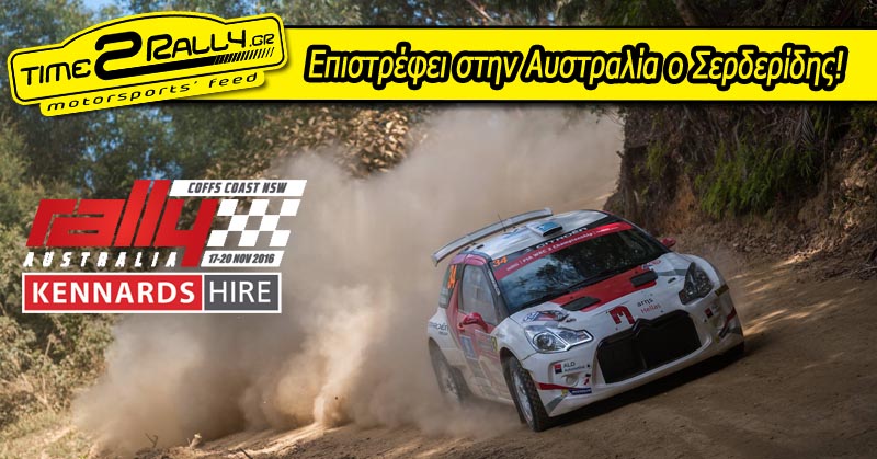 Ο Καβαλιώτης εκπρόσωπός μας στο κορυφαίο πρωτάθλημα ράλλυ του πλανήτη εμφανίζεται για δεύτερη φορά στην Αυστραλία, καθώς στην πρώτη του απόπειρα το 2014 είχε εγκαταλείψει από μηχανικό πρόβλημα μόλις στην τελευταία ειδική του αγώνα: «Κάτι αφήσαμε στη μέση το 2014. Η Αυστραλία είναι ένας αγώνας που μου αρέσει και γι’ αυτό τον συμπεριέλαβα στο φετινό μου πρόγραμμα.», τόνισε ο Σερδερίδης, ενώ αναφορικά με το στόχο του στον αγώνα, δήλωσε: «Η τελευταία μου εμφάνιση στο χώμα ήταν τον Οκτώβριο του 2015 στο Ράλλυ Ακρόπολις, οπότε πρέπει σιγά-σιγά να βρω και πάλι το ρυθμό μου σε αυτή την επιφάνεια. Θα ξεκινήσουμε φυλαγμένα και στη συνέχεια ευελπιστούμε να ανεβάσουμε ρυθμό. Οι αντίπαλοί μου είναι αρκετά γρήγοροι, οπότε θα προσπαθήσω να επικεντρωθώ σε έναν αλάνθαστο αγώνα, χωρίς να δίνω ιδιαίτερη σημασία στην κατάταξη».