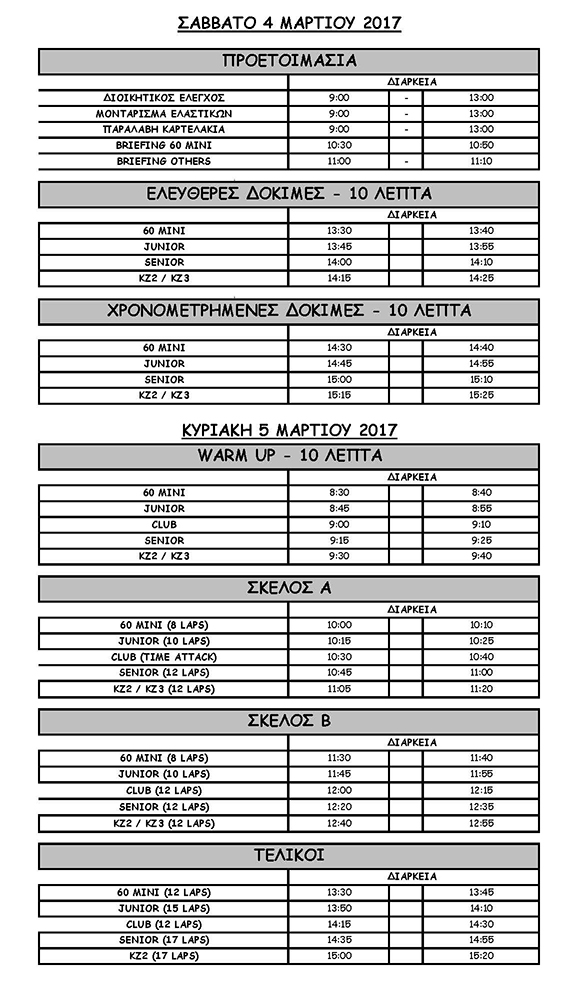 Ένα σημαντικό στοιχείο διαφοροποίησης σε σύγκριση με την περσινή χρονιά, έγκειται στη διάρκεια και δομή κάθε γύρου του Πανελλήνιου Πρωταθλήματος Karting. Οι αγώνες του φετινού θεσμού θα είναι διήμεροι, με τα Ελεύθερα Δοκιμαστικά και τις Κατατακτήριες Δοκιμές, να διεξάγονται πια το Σάββατο. Οι Κυριακές θα είναι αφιερωμένες στους αγώνες, με τις Κατηγορίες Πρωταθλήματος (60 Mini, Junior, Senior, ΚΖ2) να περιλαμβάνουν δυο σύντομα προκριματικά σκέλη και έναν μεγάλο τελικό! Ο λόγος αυτής της επιλογής, έγκειται στο γεγονός ότι περισσότεροι αγώνες συνεπάγονται μεγαλύτερες συγκινήσεις, ενώ απαιτούν εξυπνότερη στρατηγική και συνεισφέρουν στην ταχύτερη αγωνιστική εξέλιξη για τους νεότερους αθλητές. Οι Κατηγορίες Επάθλων (Hobby), δηλαδή η Club και η νεοσύστατη ΚΖ3 θα περιλαμβάνουν ένα time attack και δυο τελικούς, διατηρώντας τη δομή που δοκιμάστηκε με επιτυχία στο τέλος του 2016. Σημειώνεται, πως οι δυο κατηγορίες αυτές θα δίνουν για πρώτη φορά βαθμούς στο αναβαθμισμένο πρωτάθλημα ομάδων (διαγωνιζομένων)!