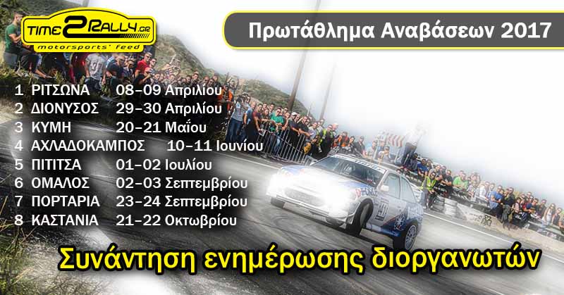 Υπενθυμίζεται ότι Πρωτάθλημα Αναβάσεων του 2017 ξεκινά στις 8 και 9 Απριλίου με την γνωστή σε όλους Ριτσώνα που διοργανώνει το σωματείο ΑΣΜΑ. Το Πρωτάθλημα του 2017 συνολικά περιλαμβάνει 8 διοργανώσεις, σύμφωνα με το εξής Πρόγραμμα: