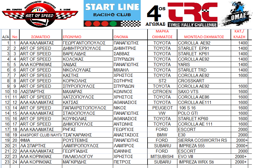 Ο 4ος αγώνας του Επάθλου Χωμάτινης Ατομικής Χρονομέτρησης (TRC) διοργανώνεται από το Αθλητικό Σωματείο “Art of Speed – ΑΣΜΑ Ηλείας” σε συνεργασία με την “Start Line”, στη γνωστή διαδρομή που βρίσκεται στο Δ.Δ. Γρύλλου Ηλείας, κοντά στα Κρέστενα, το προσεχές Σαββατοκύριακο 26 και 27 Αυγούστου.