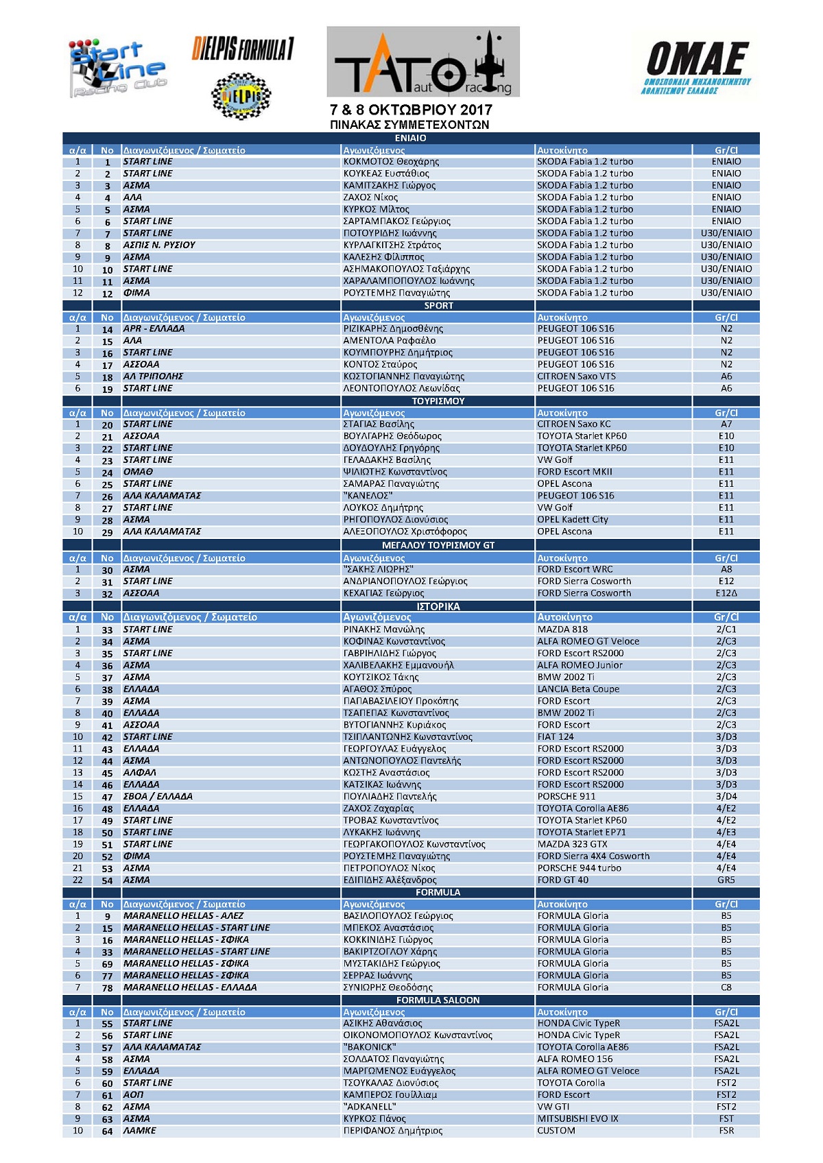 Αυτές είναι επτά στο σύνολο, με εκείνη που συγκεντρώνει τις περισσότερες συμμετοχές να είναι των ιστορικών αυτοκινήτων με 22 συμμετέχοντες. Παράλληλα τα 12 SkodaFabia του Ενιαίου αλλά και τα 7 μονοθέσια της FormulaGloria θα συμπληρώσουν θεαματικά και με μεγάλο ενδιαφέρον τις βασικές κατηγορίες Sport, Τουρισμού, Μεγάλου Τουρισμού GT και FormulaSaloon στις οποίες θα δούμε συνολικά άλλα 29 αυτοκίνητα.