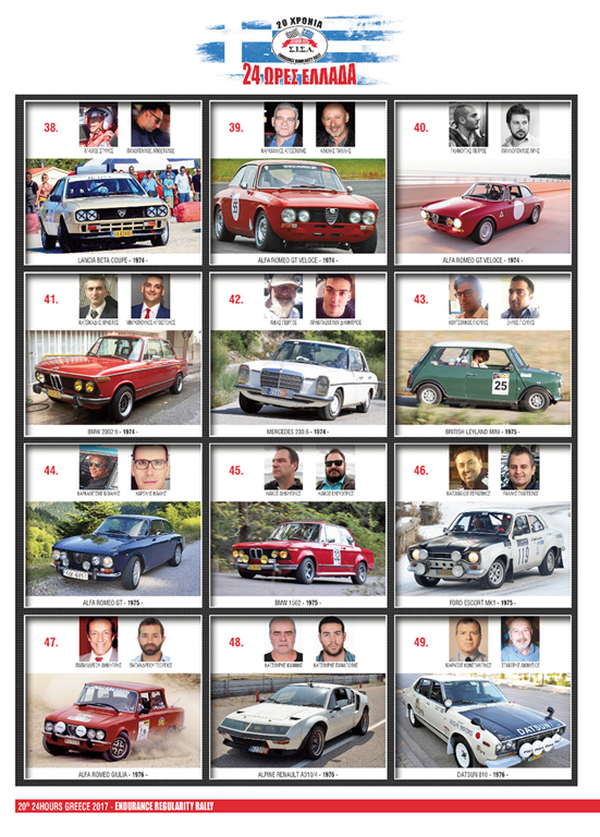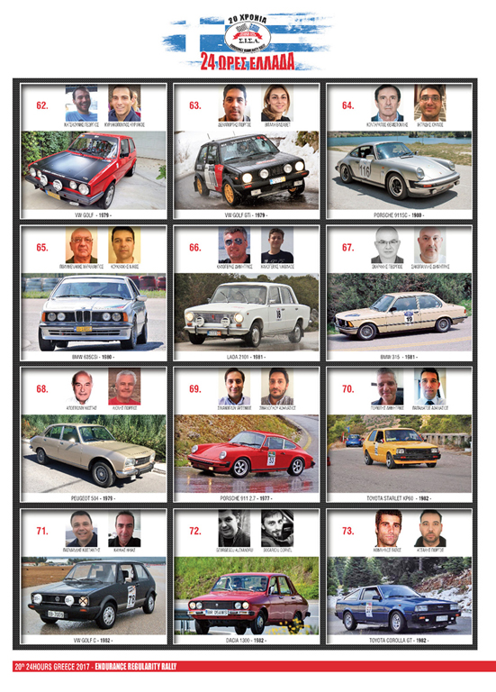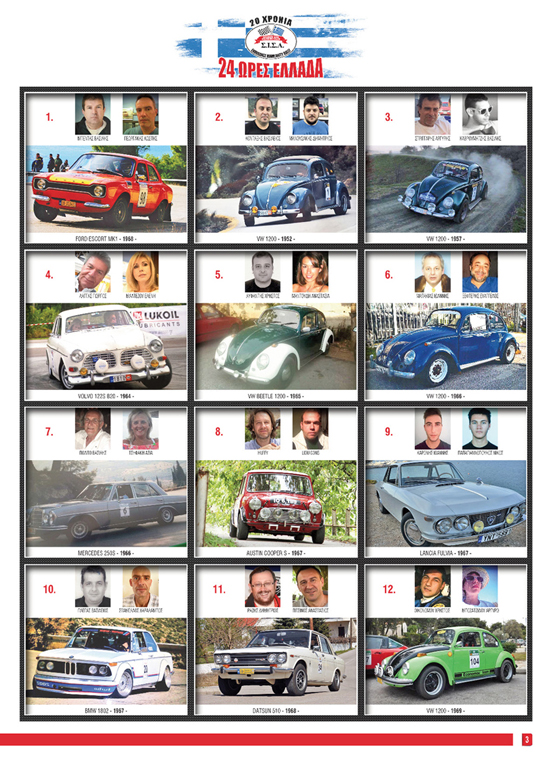 Ενενήντα οκτώ ετοιμοπόλεμα πληρώματα με τα καλά προετοιμασμένα ιστορικά αυτοκίνητα τους θα ξεκινήσουν στις 9:00 το πρωί από την Ακρόπολη με κατεύθυνση προς Ισθμό και μετά προς Κλειτορία, όπου θα γίνει και η πρώτη ανασυγκρότηση της ημέρας. Μετά σειρά έχει η Πάτρα όπου θα γίνει και η τρίωρη νυχτερινή ανασυγκρότηση του 20ου «24 Ώρες Ελλάδα» και θα τερματίσει το έπαθλο «12 Ώρες Ελλάδα».