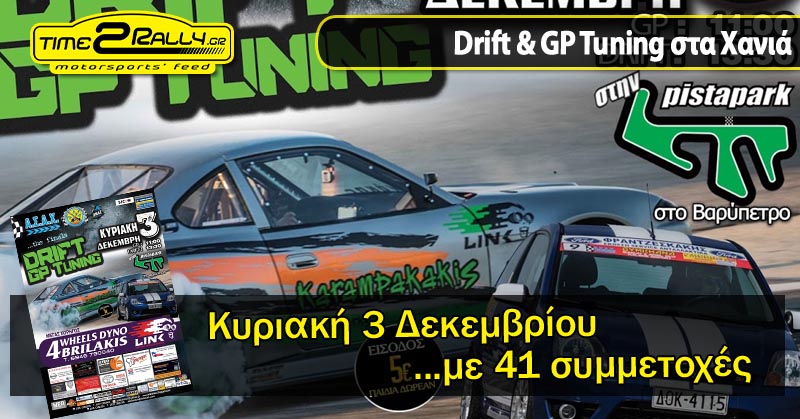 Την Κυριακή 3 Δεκεμβρίου, στην Pista Park των Χανίων, θα διεξαχθεί ο τελικός αγώνας Drift και GP Tuning που διοργανώνει το Αθλητικό Σωματείο Αυτοκινήτων Χανίων (ΑΣΑΧ) και η Αθλητική Λέσχη Αυτοκινήτου Χανίων (ΑΛΑΧ).