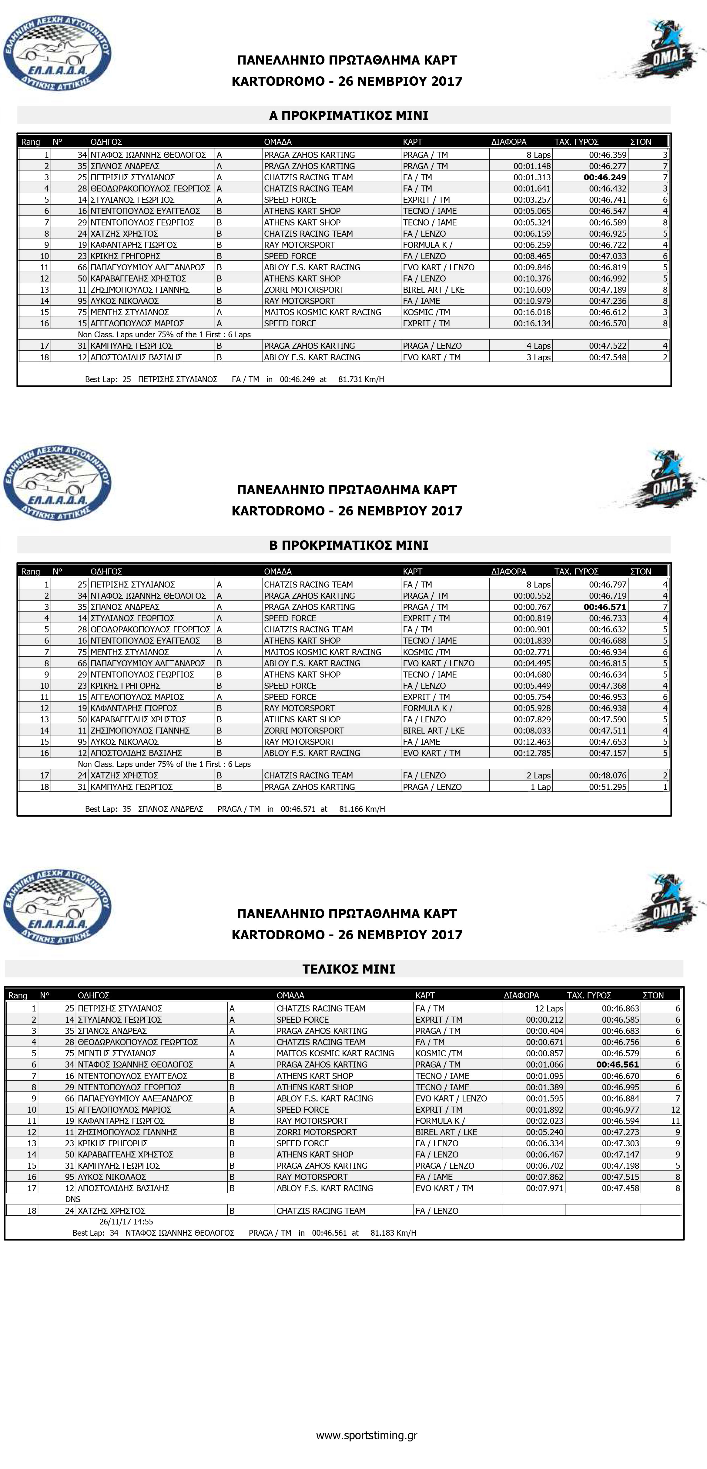 Όσο για τη Mini B, ο Βαγγέλης Ντεντόπουλος (Athens Kart Shop, Tecno-IAME) κέρδισε και τους τρεις αγώνες της ημέρας. Ο Γιώργος Ντεντόπουλος είχε, στους τρεις αγώνες της ημέρας, δύο δεύτερες και μια τρίτη θέση, ο Αλέξανδρος Παπαευθυμίου (Abloy F.S. Kart Racing, Evo Kart-Lenzo) είχε μια δεύτερη και μια τρίτη και ο Χρήστος Χατζής (Chatzis Racing Team, FA-Lenzo) μία τρίτη.