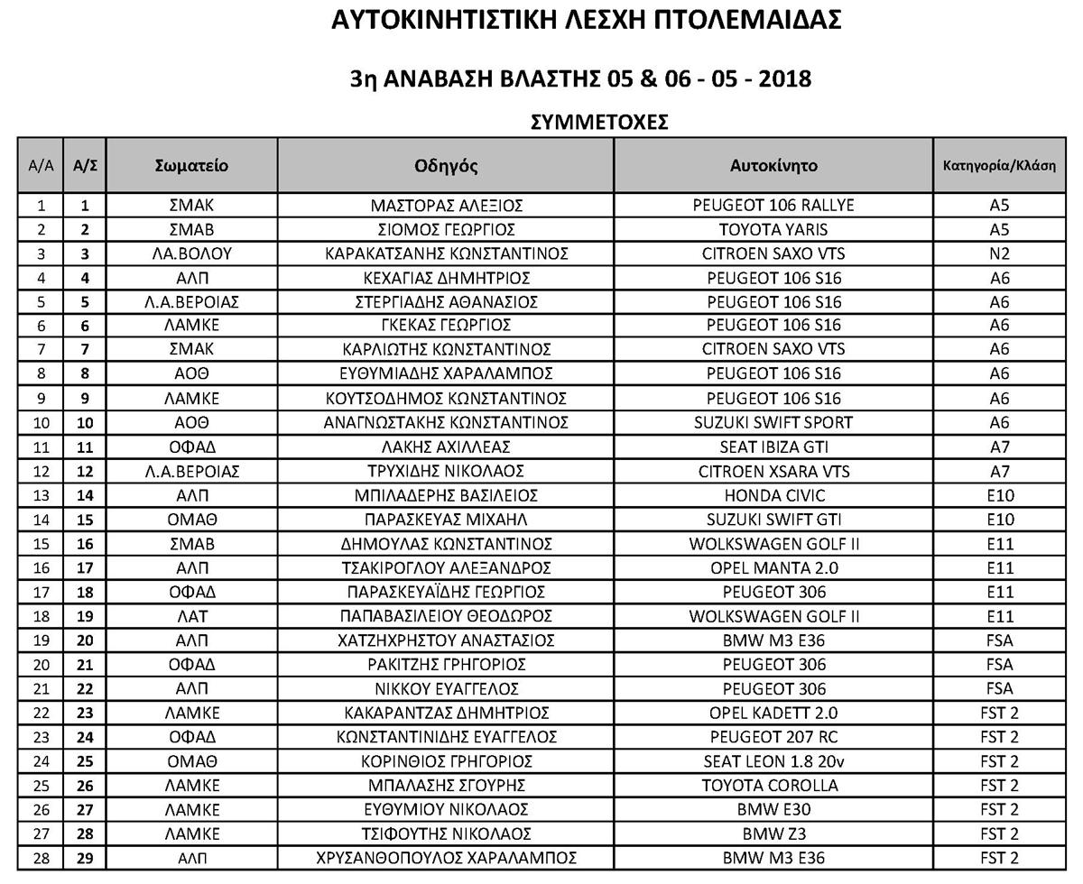 Ανακοινώθηκε και επισήμως ο πίνακας συμμετοχών που αφορά στην 3η Ανάβαση Βλάστης την οποία θα διοργανώσει η Αυτοκινητιστική Λέσχη Πτολεμαΐδας το Σαββατοκύριακο 05 και 06 Μαΐου.