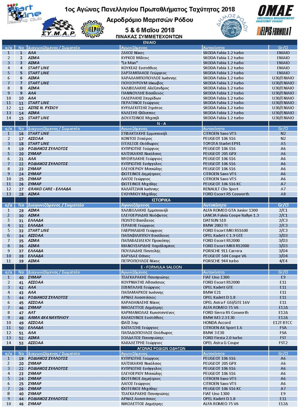 Οι συμμετοχές υπερβαίνουν τις προσδοκίες των οργανωτών StartLine και Dielpis Περί Αγώνων, που υποσχέθηκαν Άνοιξη του Μηχανοκίνητου Αθλητισμού στο νησί των Ιπποτών, όπως παλαιά. Ήδη οι αγωνιστικές εξατμίσεις ηχούν στο λιμάνι, στο Δημαρχείο και στην Πόλη, ξυπνώντας μνήμες.
