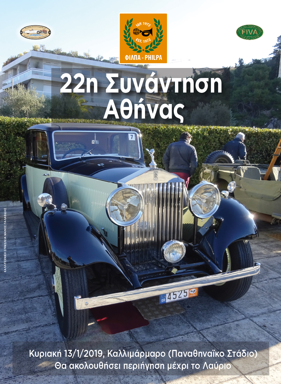 Την Κυριακή 13 Ιανουαρίου 2019 η ΦΙΛΠΑ καλωσορίζει το νέο έτος με την καθιερωμένη Συνάντηση Αθήνας στο Καλλιμάρμαρο Παναθηναϊκό στάδιο. Η Συνάντηση Αθηνών θα πραγματοποιηθεί για 22η συνεχόμενη φορά, είναι η πρώτη εκδήλωση της χρονιάς και σηματοδοτεί την έναρξη της νέας σαιζόν. Όπως κάθε χρόνο, τα αυτοκίνητα θα συγκεντρωθούν στις 10:00 το πρωί στο Παναθηναϊκό Στάδιο και θα παραμείνουν στο χώρο για τέσσερις περίπου ώρες, δίνοντας έτσι τη δυνατότητα στο κοινό να θαυμάσει τα πανέμορφα ιστορικά αυτοκίνητα, στρατιωτικά οχήματα και μοτοσικλέτες, ηλικίας από 30 έως 90 ετών, με την γοητευτική παλαιά τεχνολογία που τα καθιστά μοναδικά αντικείμενα της πολιτιστικής μας κληρονομιάς. Φέτος, μετά την συνάντηση, για όποιους επιθυμούν, έχει οργανωθεί μια βόλτα για τους συμμετέχοντες με προορισμό το Λαύριο. Στη διαδρομή, τα πληρώματα θα μπορέσουν να απολαύσουν ένα γεύμα ή έναν καφέ δίπλα στη θάλασσα όπου επιλέξουν.