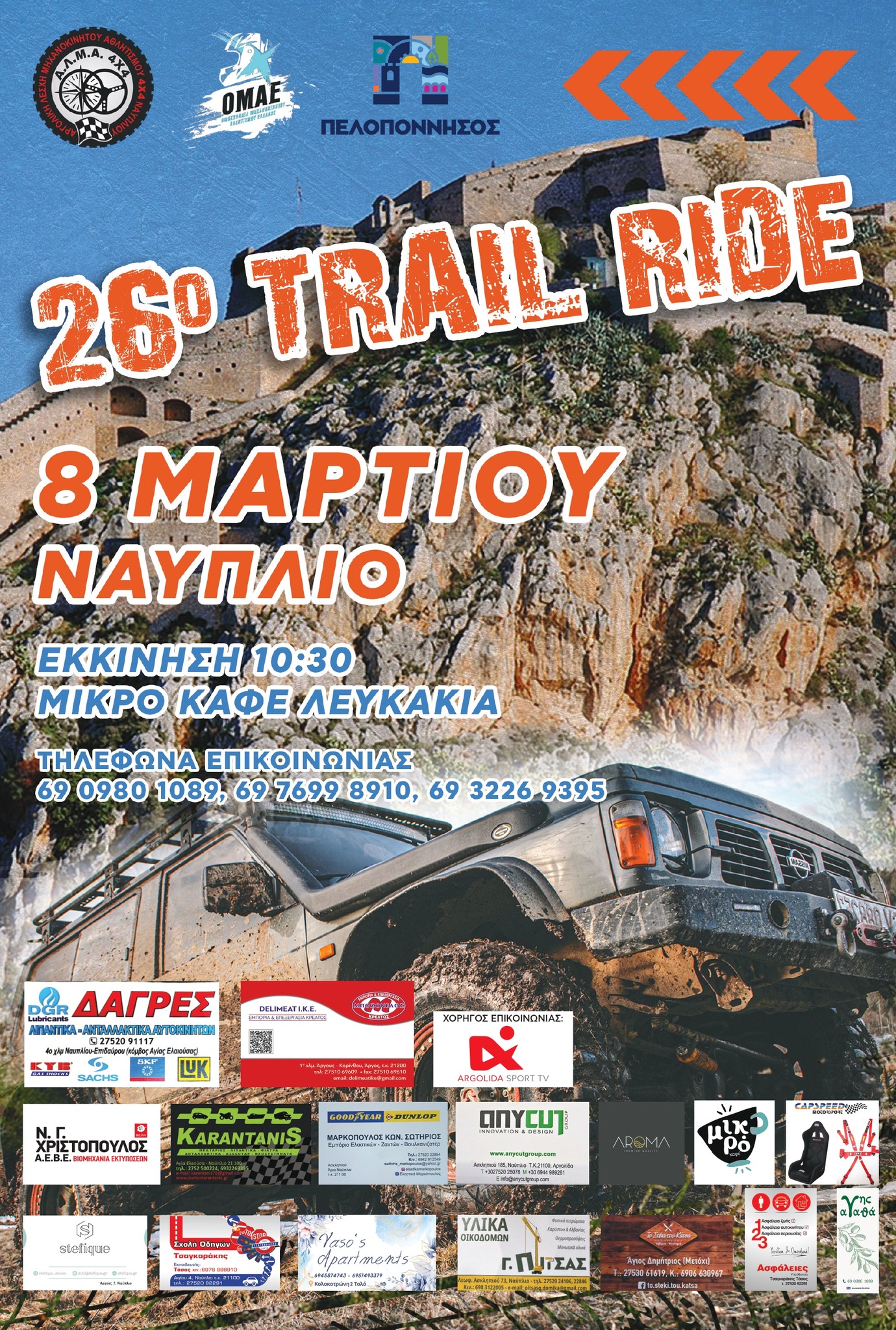 Tο 26ο Trail RIde θα διεξαχθεί στην Αργολίδα την Κυριακή 8 Μαρτίου 26 με εκκίνηση στα Λευκακια Ναυπλίου και τερματισμό στο λιμάνι της Νέας Κιου.