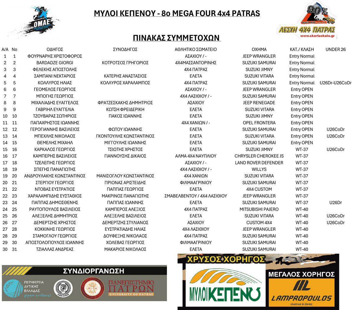 Η Λέσχη 4χ4 Πάτρας “Skartaekato” με την συνδιοργάνωση της Περιφέρεια Δυτικής Ελλάδος και της Αντιπεριφέρειας Αθλητισμού, την υποστήριξη του Πανεπιστημίου Πατρών, του Δήμου Πατρέων και του Εμπορικού και Εισαγωγικού Συλλόγου Πατρών και την απαραίτητη άδεια της ΟΜΑΕ (Ομοσπονδίας Μηχανοκίνητου Αθλητισμού Ελλάδος) διοργανώνει αγώνα εκτός δρόμου με 4χ4 οχήματα με την ονομασία «ΜΥΛΟΙ ΚΕΠΕΝΟΥ – 8ο MEGAFOUR 4χ4 Πάτρας» την Παρασκευή 13, το Σάββατο 14 και την Κυριακή 15 Μαρτίου 2026, σε ιδιωτικό χώρο του Πανεπιστημίου Πατρών παραπλεύρως του Γηπέδου του Νέου Σουλίου (ανάμεσα από Καρυά Πατρών και Ρυάκι Πατρών).