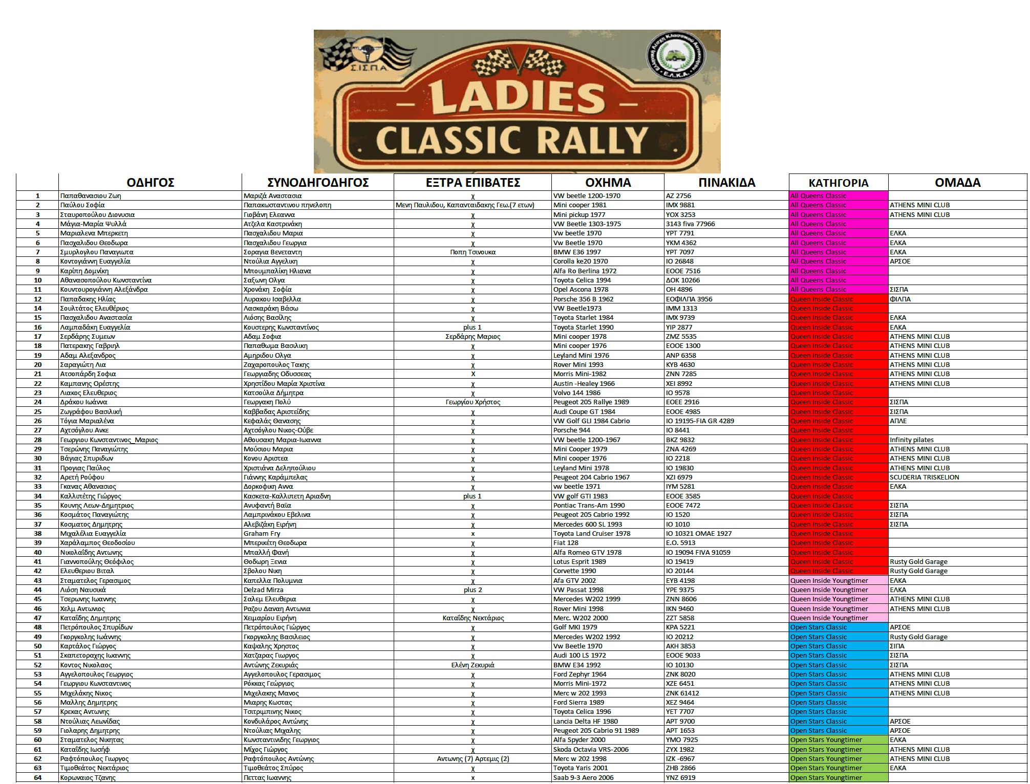 Η λίστα των προσωρινών συμμετοχών επιβεβαιώνει τον ξεχωριστό χαρακτήρα του αγώνα, με εντυπωσιακή ποικιλία ιστορικών μοντέλων. Ενώ ιδιαίτερο ενδιαφέρον έχει ο μεγάλος αριθμός γυναικείων πληρωμάτων στην κατηγορία All Queens, που δίνουν τον τόνο σε μια διοργάνωση αφιερωμένη στη γυναικεία παρουσία στο motorsport.