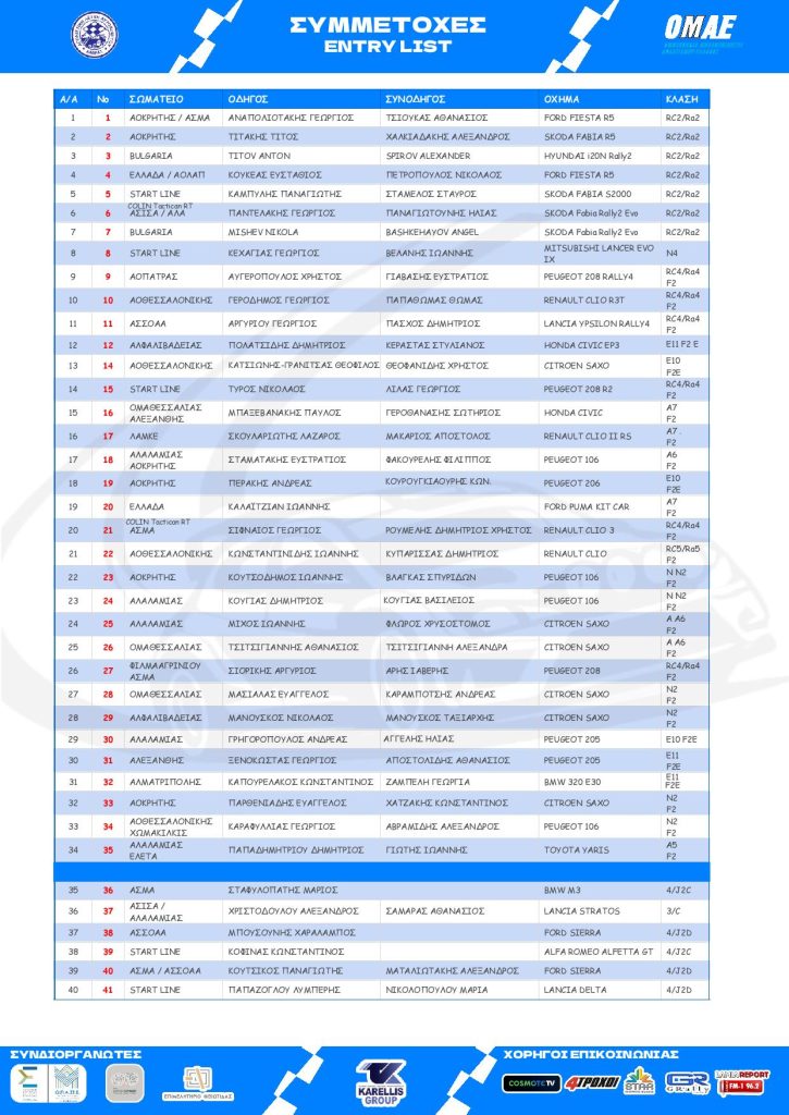 Με ένα Honda Civic Type R EP3 θα αγωνιστούν στο Ράλλυ Λαμίας οι «Βόρειοι» Παύλος Μπαξεβανάκης-Σωτήρης Γεροθανάσης, με στόχο να πρωταγωνιστήσουν στο νεοσύστατο Κύπελλο της κατηγορίας Α που προκήρυξε φέτος η ΟΜΑΕ. Από τη Βόρεια Ελλάδα «κατεβαίνει» για την πρεμιέρα του πρωταθλήματος και ο Λάζαρος Σκουλαριώτης, ο οποίος με συνοδηγό τον Απόστολο Μακάριο στο δεξί μπάκετ ενός Renault Clio RS, θα αγωνιστούν για ένα θετικό αποτέλεσμα στη Λαμία, τόσο στην κατηγορία Α, όσο και στην F2. Στη ράμπα της εκκίνησης το απόγευμα του Σαββάτου 21 Μαρτίου θα βρεθούν οι Κρητικοί Στράτος Σταματάκης-Φίλιππος Φακουρέλης (Peugeot 106 S16), με τον οδηγό να κάνει δυναμικό comeback έπειτα από το ατύχημα που είχε στο τέλος της περασμένης αγωνιστικής χρονιάς. Στην κατηγορία Α συμμετέχει επίσης ο Ιωάννης Καλαϊτζιάν με Ford Puma Kit Car, καθώς επίσης και οι Αθανάσιος Τσιτσιγιάννης-Αλεξάνδρα Τσιτσιγιάννη με Citroen Saxo. Στον μόλις τέταρτο αγώνα της σύντομης αγωνιστικής καριέρας τους, οι Λαμιώτες Ιωάννης Μίχος-Χρυσόστομος Φλώρος θα λάβουν μέρος με ένα Citroen Saxo, στοχεύοντας σε περαιτέρω αγωνιστική πρόοδο, ενώ τις συμμετοχές στην κατηγορία Α συμπληρώνουν οι Δημήτρης Παπαδημητρίου-Ιωάννης Γιώτης με Toyota Yaris.